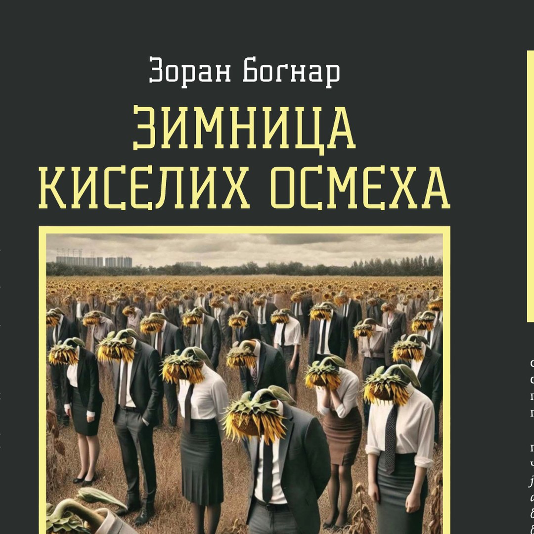 Korice tu poetiku prevode u snažan vizuelni znak. Polja figura sa glavama suncokreta deluju kao pastoralna groteska: čovek prelazi u biljku, lice u amblem, zajednica u dekor. Ta slika odlično odgovara sadržaju knjige, jer Bognar stalno ispituje koliko individue još ima u vremenu uniformisanih reakcija, masovne sugestije i ukiseljenog osmeha, osmeha sačuvanog, ali izmenjenog hemijom epohe.